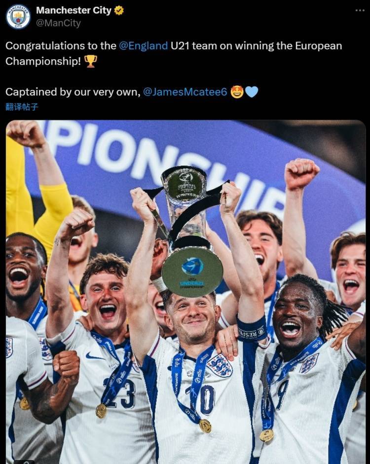 曼城小将麦卡蒂当选决赛MVP并作为队长捧起奖杯,曼城官方也晒照送上祝贺:“祝贺英格兰U21夺得欧青赛冠军,他们的队长正是我们的麦卡蒂!”